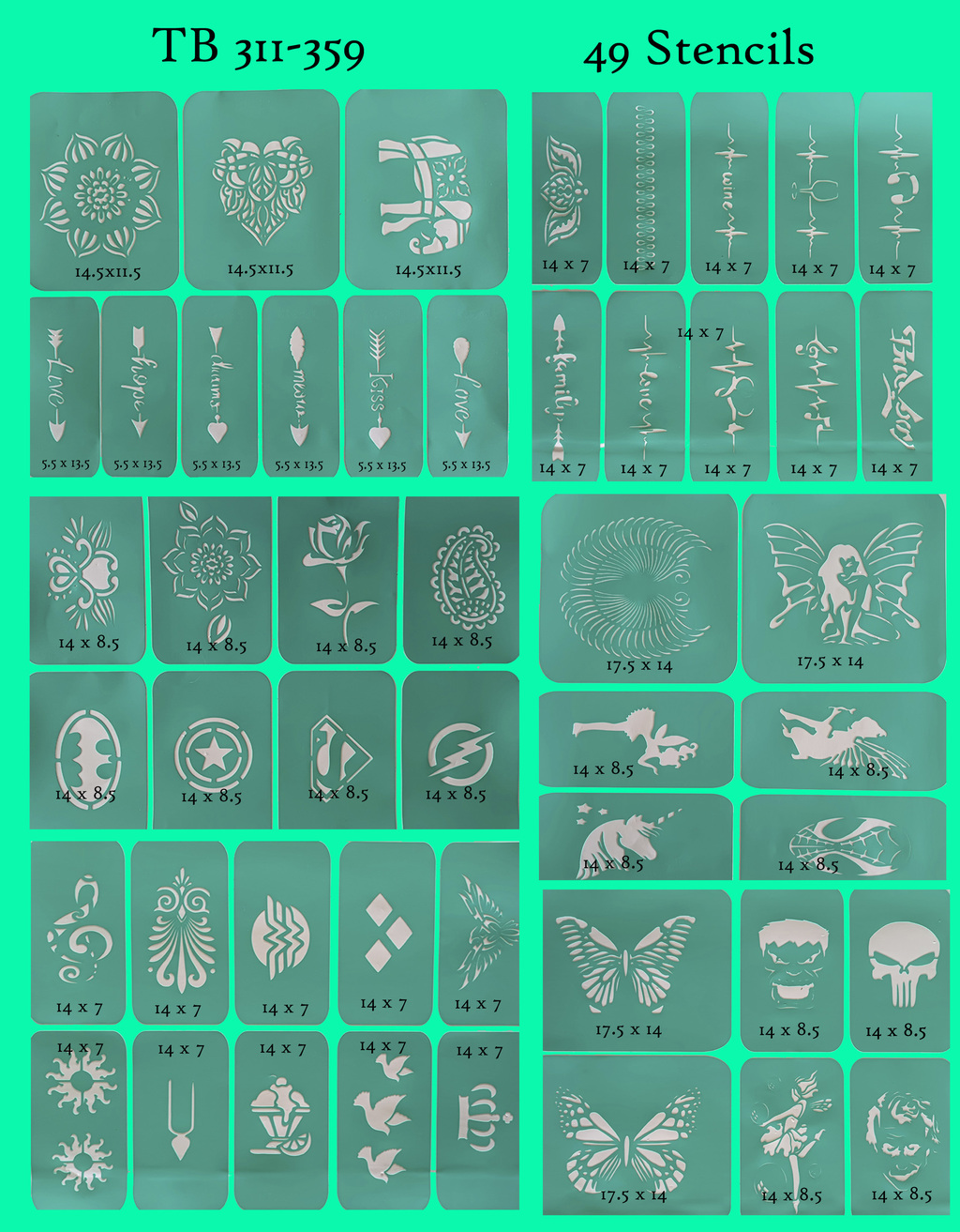 White, Red, Pink, Orange, Golden yellow, Green, Blue, Purple